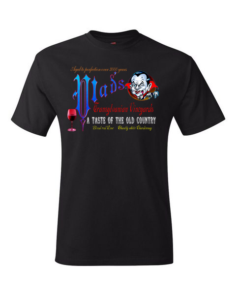 SOLD OUT! "I NEVER drink...wine!" Vlad may never drink it, but his Transylvanian Winery will pump out bottles of Blood Red Rose' and Ghastly White Chardonnay! Show your love for the tase of the old country with these super cool black Vlad t-shirts! Fits and looks great on both Men AND Women (and especially cool on Vampires!) 100% preshrunk cotton Hanes tagless Tee!