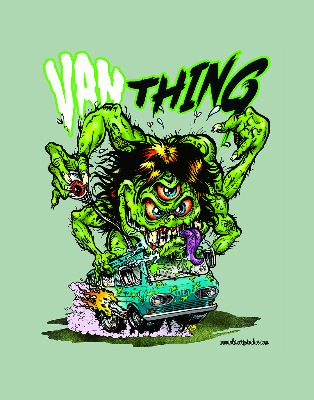 BACK IN STOCK! From our HOT ROD HELLIONS collection. From the bayou he comes in his souped up '68 Ford Econoline van. WHAT IS IT?? This deluxe 11"x14" full color print on heavy duty cardstock comes bagged and boarded for your protection, but with a creature like this...we can't guarantee how safe you are! Get yours today...this is our FAVORITE design so far!